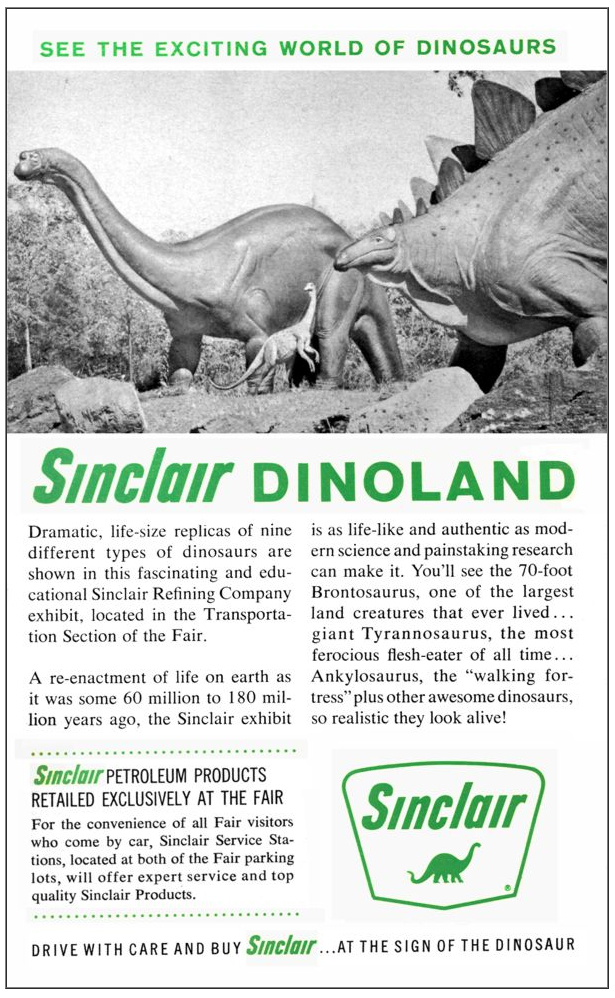 Uno de los puntos fuertes de la feria fue la exposición "Dinoland" de la compañía petrolera Sinclair. En ella se podían ver réplicas a tamaño real de nueve dinosaurios diferentes, incluido el brontosaurio de su logo. En la descripción de la exposición se podía leer: "La vida, tal y como existía hace 165 millones de años, se recrea de forma auténtica y vívida en "Dinoland", una gran exhibición paleontológica delimitada por un muro decorativo y un edificio expositivo en forma de L parcialmente oculto. Las réplicas de dinosaurios a tamaño real han sido creadas por el distinguido escultor de animales, Louis Paul Jonas".