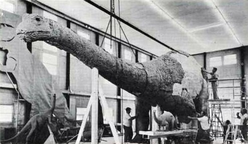 Trabajando con la figura del brontosaurio en el estudio de Louis Paul Jonas