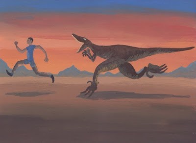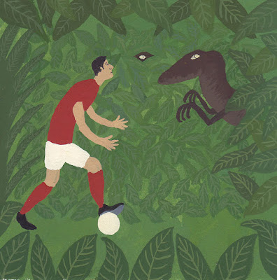 Alex Chilvers es un ilustrador, pintor y animador de Grimsby (Gran Bretaña). Después de pasar su infancia jugando al fútbol y pintando dinosaurios, se graduó en Dibujo por el Royal Drawing School de Londres. Desde entonces, ha trabajado para BBC Three o Bullion Productions y ha expuesto en la Mercer Chance Gallery. Si se echa un vistazo al global de su obra, pronto reconocemos los elementos que marcaron su niñez: el fútbol y los dinosaurios. Sus pinturas muestran escenas del juego en las que intervienen enormes tiranosaurios. Pero no todo se reduce a lo balompédico, ya que también es capaz de colocar mosasaurios en piscinas o raptores en las gradas de Wimbledon. Aquí dejamos una muestra: