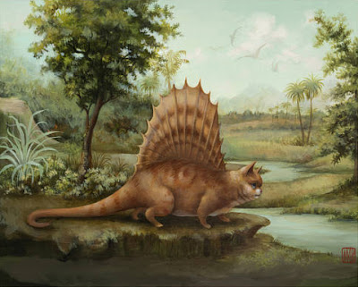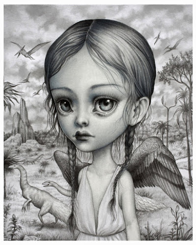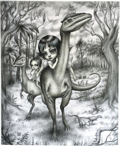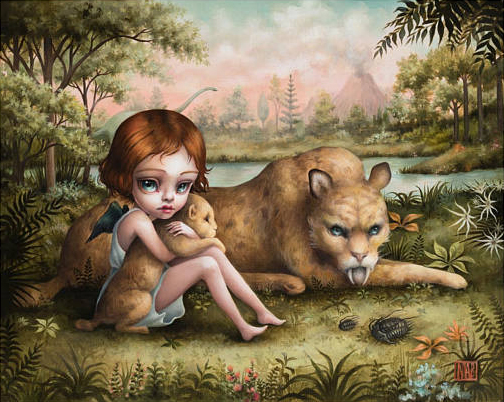 Mab Graves es una artista de Indianapolis (Estados Unidos) cuyo trabajo presenta claras referencias a la ciencia, la literatura clásica y la cultura espacial de los 60. Totalmente autodidacta, su estilo bebe del surrealismo pop contemporáneo y tiene influencias de artistas como Mark Ryden o Joe Coleman. Ha realizado varias exposiciones individuales, entre las que destaca "Children of the Nephilim" en Monster Gallery. En esta serie de pinturas reúne a los llamados nefilim, seres que según el Génesis serían los descendientes de los "hijos de Dios" (ángeles que dejaron sus puestos en el cielo o más bien rebeldes) y las "hijas de los hombres" (raza humana) que habitaban la Tierra antes del diluvio. Junto a ellos, diferentes animales antediluvianos: dinosaurios, pterosaurios, tigres dientes de sable, etc. Por otro lado, Graves es una apasionada de los gatos y ha experimentado en diferentes obras con una hibridación de estos animales con dinosaurios. Si quieres profundizar más en el trabajo de esta interesante artista, puedes visitar su Instagram o su tienda de Etsy. Ahí dejamos una muestra: