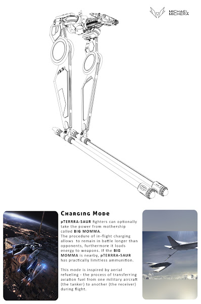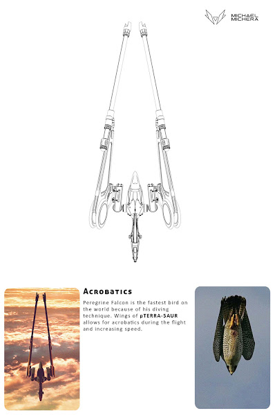 Michael Michera es un artista de Łódź (Polonia) especializado en el diseño conceptual de maquinas, robots, criaturas y personajes de estilo futurista. Apasionado de la ciencia-ficción y la biología, ha ganado varios certámenes y ha sido invitado por Pixologic al ZBrush Live Sculpt-Off de 2017, encuentro en el que se juntan los principales diseñadores 3D a nivel mundial. Uno de sus últimos proyectos es pTERRA-5AUR, diseño de un prototipo de aeronave en el que incluye conceptos biológicos tanto en su funcionamiento como en su morfología. Por ejemplo, se inspira en el vuelo del halcón peregrino para imaginar el tipo de acrobacias de aparato o en la anatomía de pterosaurios para diseñar su aterrizaje.
