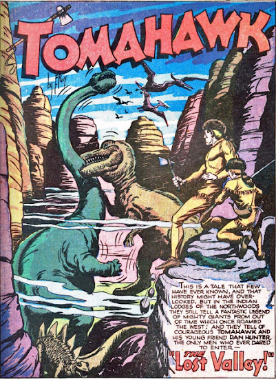 En "El dinosaurio fronterizo" (Tomahawk #58, 1958), un dinosaurio congelado en hielo es revivido y ataca a una tribu india cercana. La imagen superior corresponde a la portada de Bob Brown para el número 109 (1967), que incluía la historia "The caveman ranger", con guión de Bill Finger y dibujos, como siempre de Fred Ray.