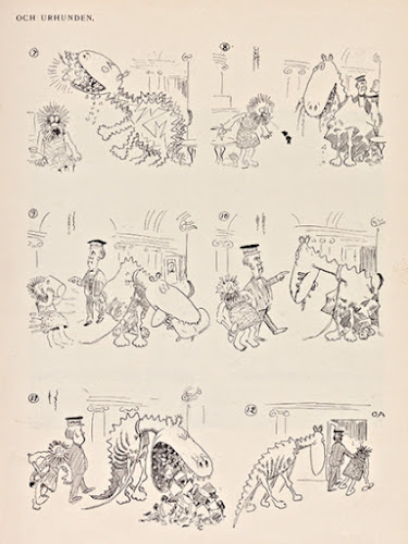 Pero Andersson también es el padre de Urhunden (1900) –literalmente, "perro primitivo"-, una suerte de extraño dinosaurio que hace las veces de mascota de un hombre prehistórico, aunque también ha sido definido como cruce entre perro y dinosaurio [3]. Urhunden tiene un carácter travieso y glotón, y no para de poner en apuros a su amo, cuyos castigos tienen poco efecto en su conducta, pues siempre vuelve a reincidir.