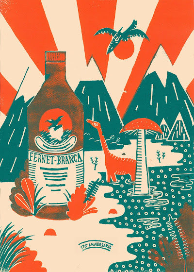 Florencia Gavilán es una ilustradora y diseñadora gráfica que además trabaja como docente en la Universidad de Buenos Aires (Argentina). Especializada en técnicas como la xilografía, en su obra encontramos, en primer lugar, esta serie de cuatro estampas mesozoicas que describen en sus palabras "una historia de amor, destrucción, dinosaurios y un gato". También dejamos su particular visión en el marco del 170 aniversario de Fernet Branca.