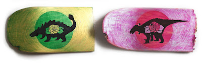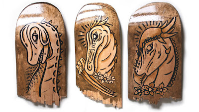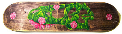 Hace poco hablábamos por aquí de Ian Ruisard, diseñador gráfico de Fort Wayne (Indiana, Estados Unidos) que incluye multitud de referencias dinosaurianas en sus trabajos. Como ejemplo, traemos hoy su serie de ilustraciones sobre madera "Veggiesaurus", en las que vemos como aprovecha trozos de monopatines como lienzo en los que los protagonistas son dinosaurios "vegetarianos", con un homenaje a Keith Haring incluido.