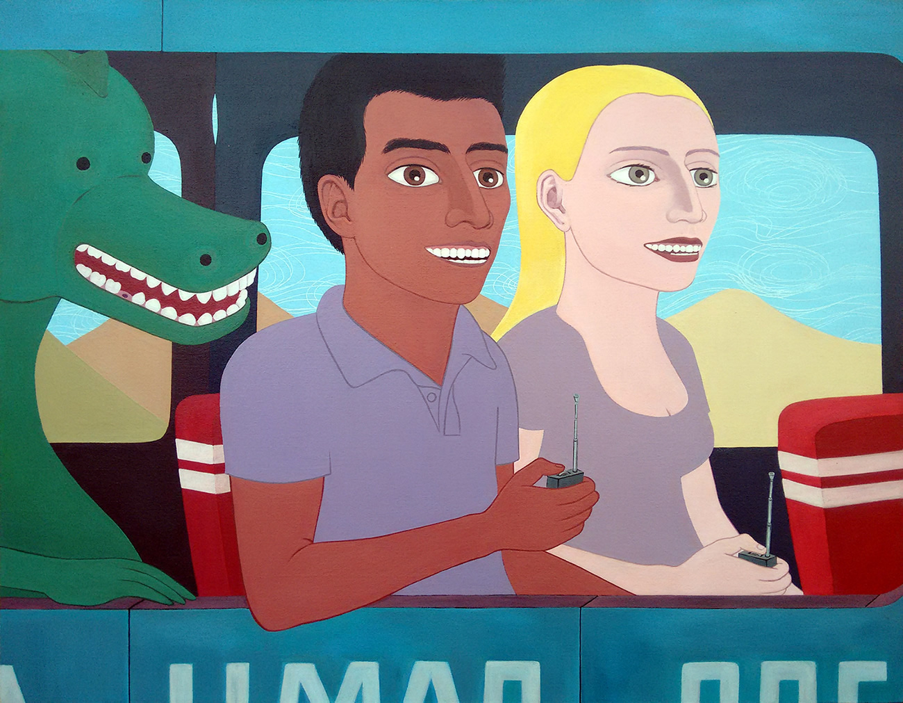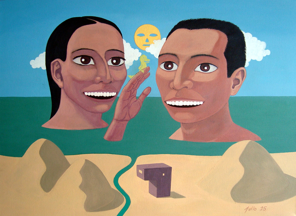 Julio César Gómez Guerrero, conocido como Julio Gómez, es un artista plástico nacido en Lima (Perú). En 1998, se licenció en Pintura y Dibujo, en la Escuela Nacional de Bellas Artes de Lima (ENBA) y desde entonces ha participado en varias exposiciones individuales y cerca de una veintena de exposiciones colectivas. En su extensa obra podemos encontrar la serie "Cuando despertó, la mujer todavía estaba allí", compuesta por varias pinturas en las que el protagonista principal o secundario es un dinosaurio, que acompaña a diferentes personajes de marcados rasgos andinos. La presencia del dinosaurio tiene que ver, según Gómez, con el cuento monterroseano, pero se adapta a diversas situaciones relacionadas con la resistencia: a una enfermedad, política, de la Pachamama al "desarrollo", a una sociedad monstruosamente racista, machista, etc. Ahí lo dejamos: