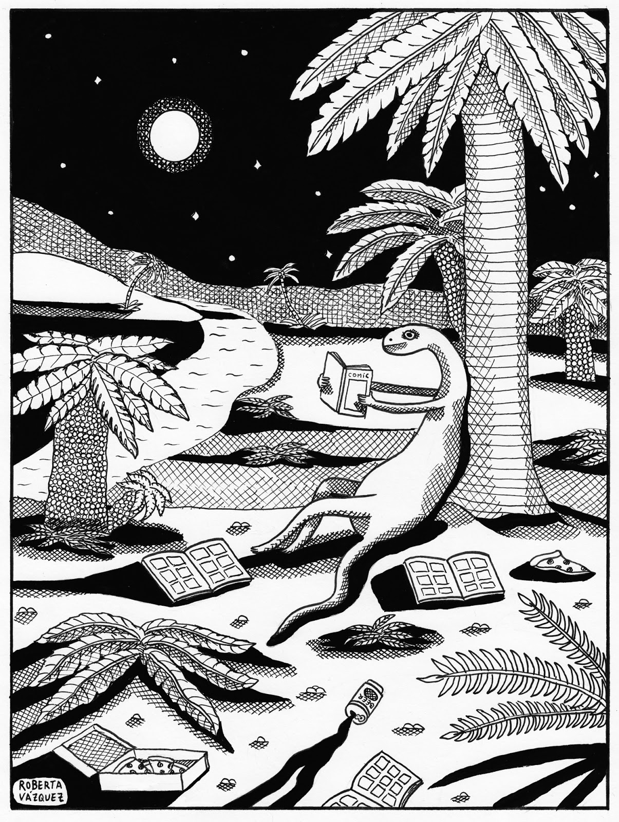 Entre los personajes antropomorfos de tus ilustraciones y tebeos llama la atención la abundancia de dinosaurios. La mayoría de aficionados a los bichos prehistóricos lo somos desde pequeños, ¿es tu caso? Si es así, dinos qué libros, cómics o pelis te marcaron de niña y adolescente.