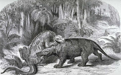 De hecho, Édouard Riou será recordado fundamentalmente por ser el primer ilustrador de Julio Verne, para el que realizó los grabados de seis novelas, a partir de Cinco semanas en globo (1863), alentada por Nadar, que ya en 1858 había fotografiado París desde el cielo y ese mismo 1863 encargó un globo gigantesco al aeronauta Eugène Godard. La que más nos interesa, y a la que ya hemos dedicado algún que otro post, es por supuesto Viaje al centro de la Tierra (1864), para la que el ilustrador realizó 56 grabados de los que 10 están dedicados a fauna extinta.
