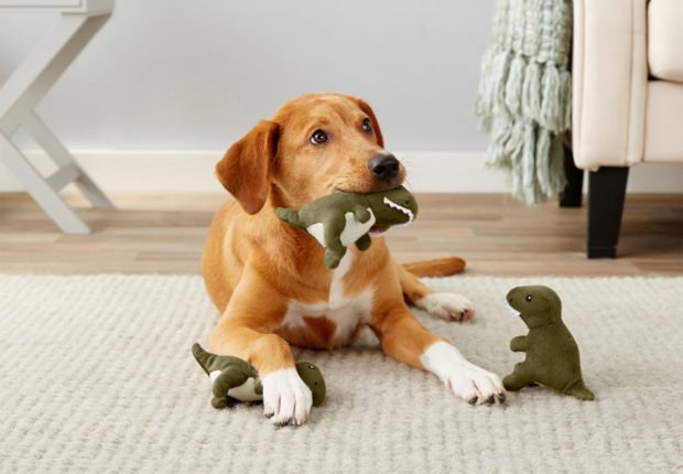 Chewy es una empresa norteamericana especializada en productos para mascotas: comida, medicamentos, ropa, complementos... y también juguetes. Como por ejemplo, este conjunto de peluches para perros compuesto por un volcán en erupción y seis pequeños terópodos para que el animal juegue, muerda y sienta la experiencia mesozoica sin moverse de casa. Se puede conseguir por algo más de quince dólares aquí. Y si al perro le gusta desmembrar y destripar dinosaurios y acaba con ellos, puedes reponerlos por solo seis dólares aquí.